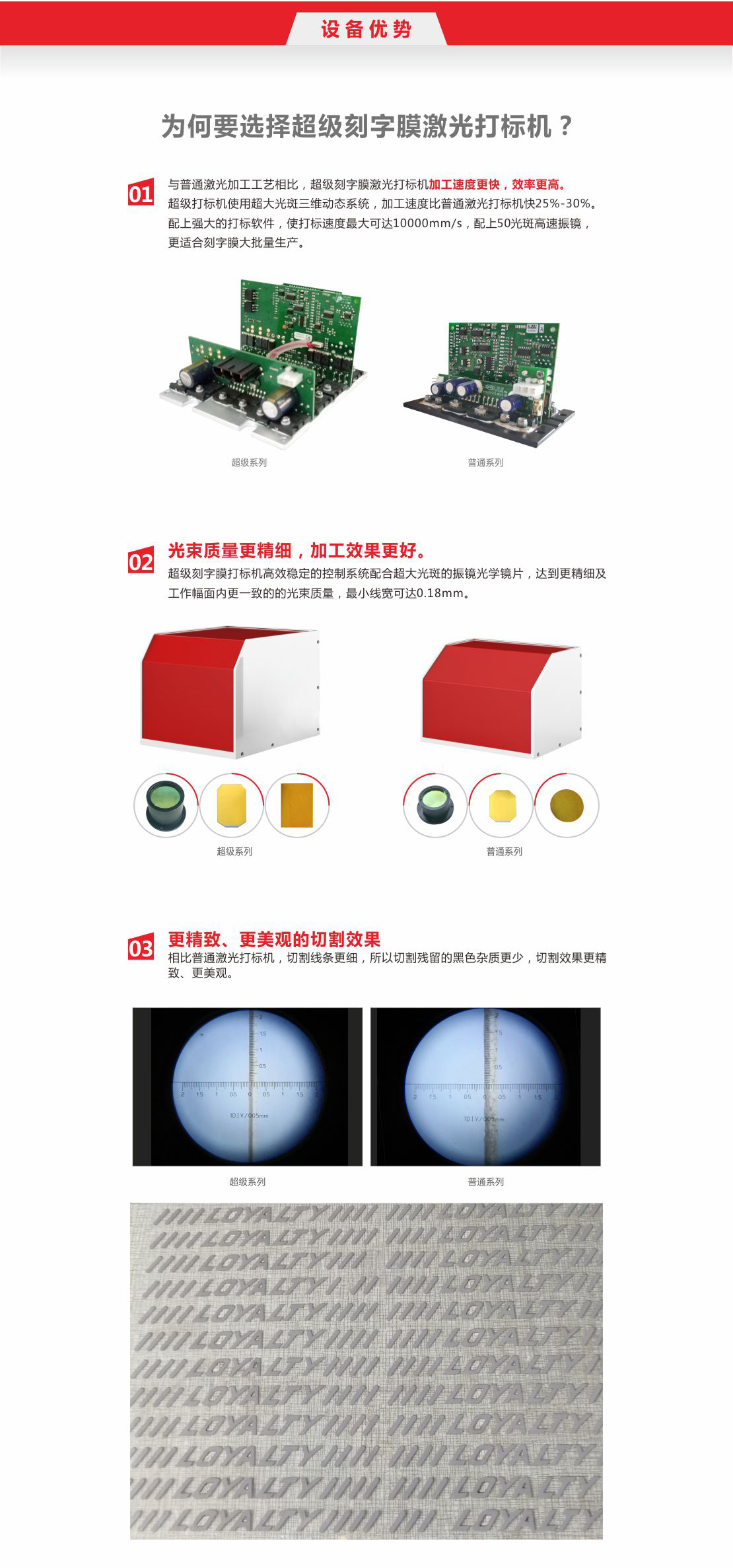 傳統(tǒng)刻字膜刻字機要刀壓、角度、速度等等因素都容易造成產(chǎn)品質(zhì)量問題,速度太快容易跳刀,刻不斷等等。而采用激光打標(biāo)技術(shù)進(jìn)行刻字膜的雕刻,速度超快精度更高,電腦精準(zhǔn)控制精度可達(dá)0.1mm,制作的刻字膜圖案更精美。