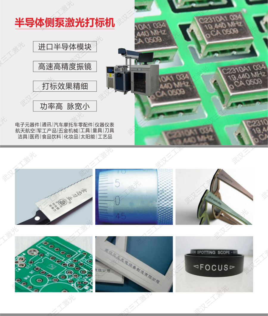 該設(shè)備適用于電子元器件、通訊、汽車摩托車零配件、儀器儀表、航空航天、軍工產(chǎn)品、五金機(jī)械、工具量具刃具、潔具、醫(yī)藥、食品飲料、化妝品、藥品包裝、醫(yī)療器械、太陽能、工藝品等行業(yè)的各種金屬和部分非金屬打標(biāo)。