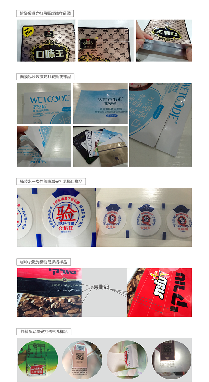 武漢三工激光是國內(nèi)率先針對薄膜包裝行業(yè)提出激光代替機械加工工藝的企業(yè),專為薄膜易撕線、定量透氣孔而設計與開發(fā)的。與傳統(tǒng)的機械齒輪壓孔相比速度更快,孔徑孔距大小可調(diào)更加均勻,可以實現(xiàn)任意方向任意形狀易撕孔(線)標刻。激光工藝制作是一種瞬間高溫處理使孔周圍熱融保護,因此完全解決了后期熱收縮后出現(xiàn)的斷裂現(xiàn)象,在手感上也非常平滑,在感官上給客戶一種新的體驗。激光易撕線和透氣孔的諸多優(yōu)勢我們前面已經(jīng)講到過很多,再次不做贅述,下面一起來看一下我們易撕線激光打孔劃線機做的不同行業(yè)以及材料的樣品吧!