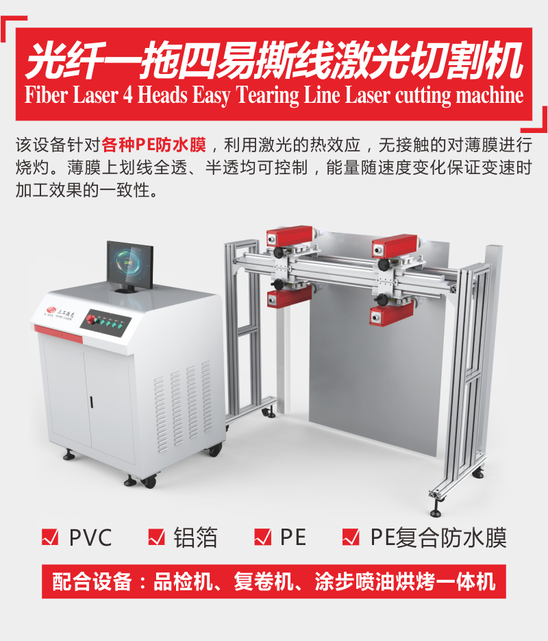 防水膜易撕線激光打標(biāo)機,適用于自粘式/防水/防潮卷材、防水膠帶等材料。速度快、使用方便,適用于有新工藝要求的防水膜廠家。加工速度≥230米/分,可配合吹膜機、涂布機、分切機使用。